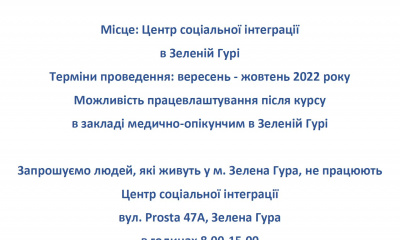 ![]() 09/12/2022 Ośrodek Integracji Społecznej zaprasza do udziału w bezpłatnym kursie "Opiekun osób niesamodzielnych" w ramach projektu unijnego "Góra pomocy 3". Kurs skierowany jest do osób z... |