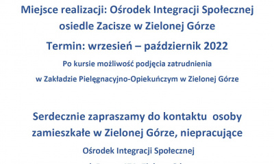 ![]() 09/12/2022 Ośrodek Integracji Społecznej zaprasza do udziału w bezpłatnym kursie "Opiekun osób niesamodzielnych" w ramach projektu unijnego "Góra pomocy 3". Kurs skierowany jest do osób z... |